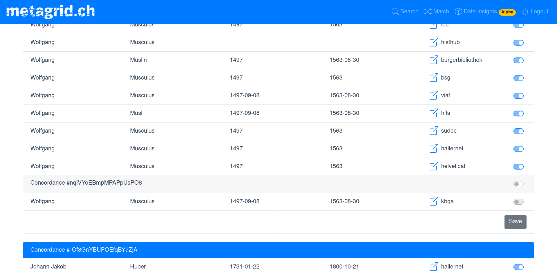After the matching has finished, you can work through the proposals. To accept a suggestion, click on the switch button in the header and save. Metagrid will link the selected proposals together and store the refused matches.