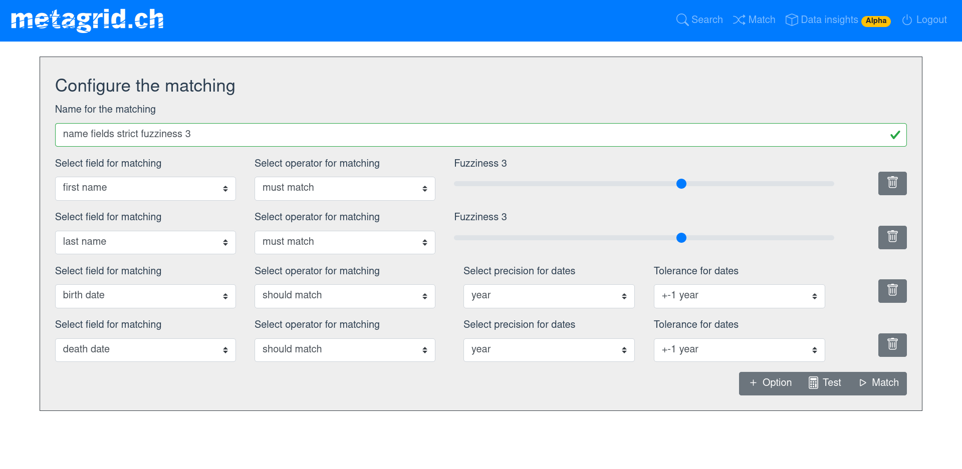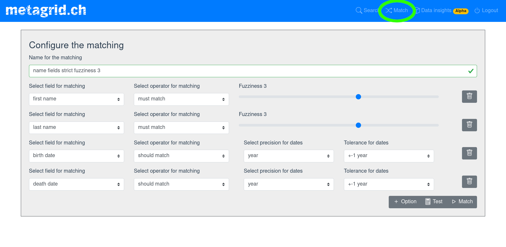 You can add options for the names, birth, and death dates. Each option has an operator. The “must match” operator excludes results not fulfilling the option. The “should match” operator will score these results lower. If there are several results, a lower score can result in a dropout.